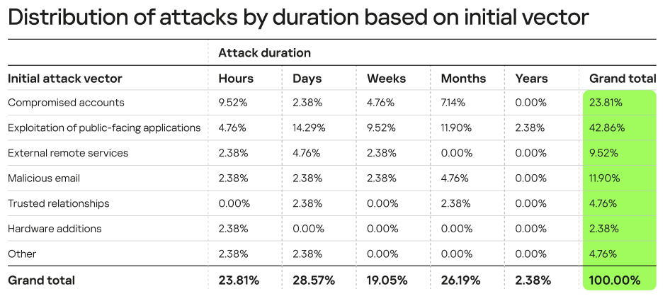 The report also revealed that the longest-running ransomware attacks began with the exploitation of public-facing applications, with just over 2 percent of them lasting for a year and more.