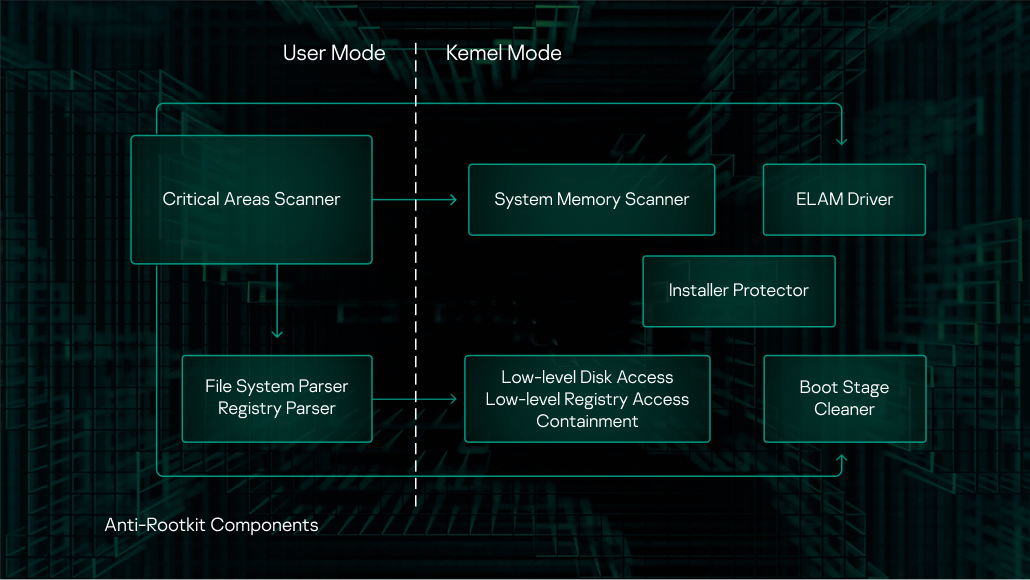 Generic approach: Anti-RootKit scans active processes, system modules, memory, AutoRun objects, and provides access to the malware code to other antivirus components such as an emulator, AV engine, static heuristics, behavior-based heuristics empowered by ML model, etc. In case of triggering by any of the listed component, the anti-rootkit disinfects the system.