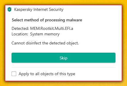 - If malicious code is detected, the user is notified by an alert that shows the malware’s location (System Memory) and the mode in which the system was booted ('MEM:Rootkit.Multi.EFI.a' verdict for UEFI mode, 'MEM:Rootkit.Multi.BIOS.a' for legacy mode).