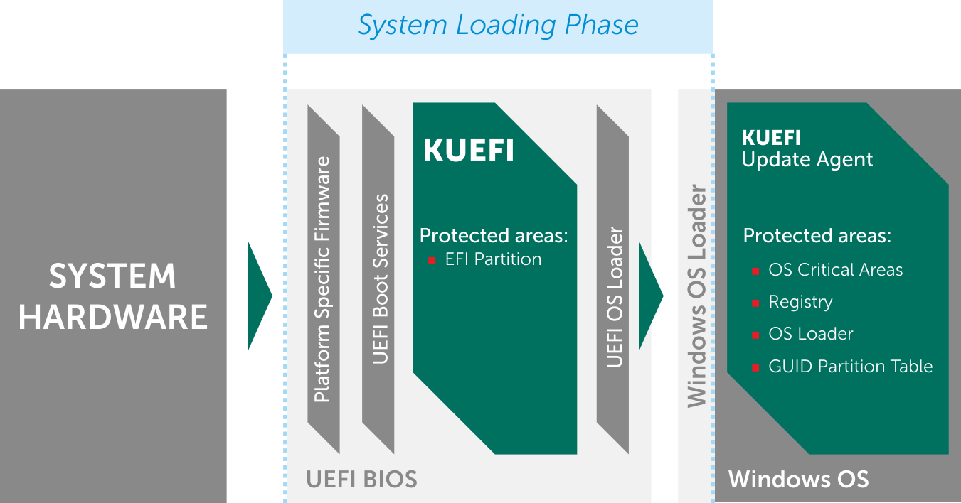 Kaspersky Anti-Virus for UEFI (KUEFI) is the EFI BIOS level endpoint security solution providing effective protection from rootkits and bootkits and ensuring safe OS loading. The product's key feature is that it starts running in the EFI environment even before the OS bootup process begins, thus preventing any resident malware from loading. By working on EFI level, KUEFI ensures reliable protection from rootkits, bootkits and other malware specifically designed to circumvent desktop anti-malware technologies.