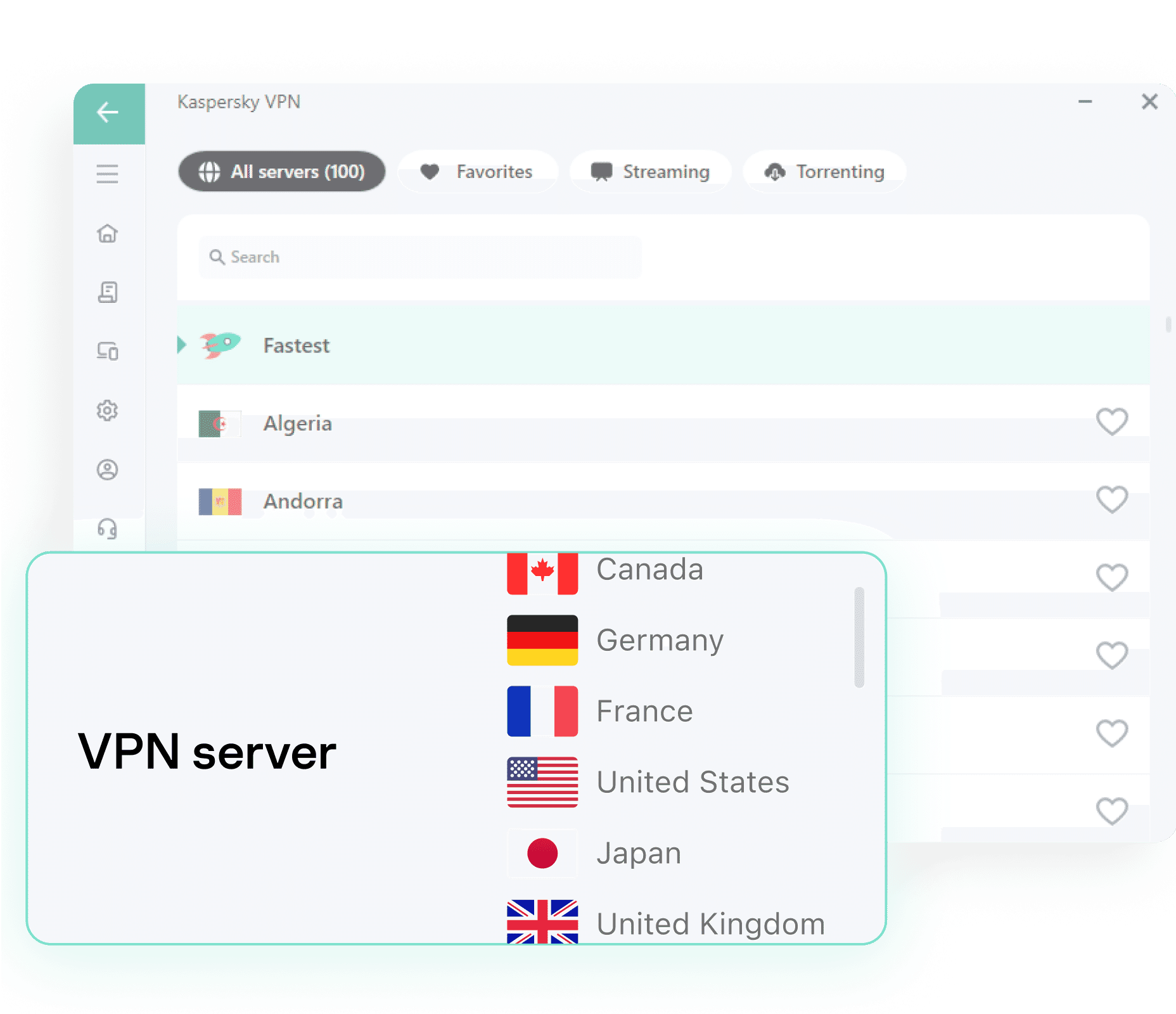 Wherever you are in the world, use your favorite apps and websites quickly and freely on Kaspersky VPN. With over 2000 safe servers in more than 100 locations, Kaspersky VPN lets you choose your server location – so you’re always in control.
