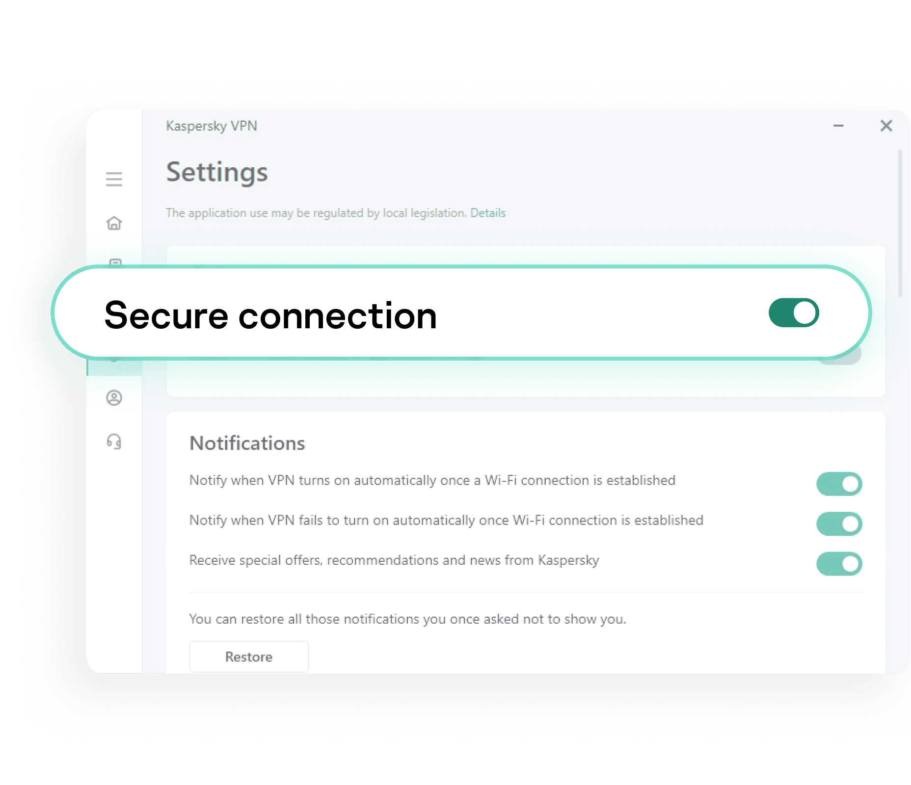 From shopping online to using public Wi-Fi, digital life comes with countless risks. Kaspersky VPN encrypts all data you send and receive, and even automatically cuts your internet connection if your VPN drops, so your data is never exposed online.