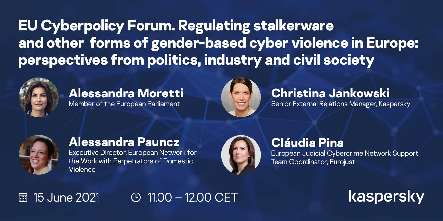 Although this topic is only recently gaining the attention it deserves at EU level, our discussion was fueled by top-class speakers from EU agencies and institutions as well as from cybersecurity stakeholders: Alessandra Moretti, Member of the European Parliament (Italy); Alessandra Pauncz, Executive Director at the European Network for the Work with Perpetrators of Domestic Violence (WWP EN); Cláudia Pina, European Judicial Cybercrime Network Support Team Coordinator at Eurojust; and Christina Jankowski, Senior External Relations Manager at Kaspersky.