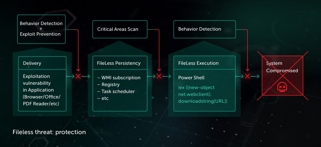 As part of its multi-layered, next generation protection, Kaspersky Lab offers several components that help to detect and protect from fileless threats: