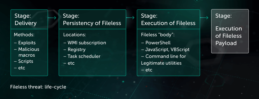 Fileless malware is malware that does not store its body directly onto a disk. This type of malware became more popular in 2017 because of the increasing complexity of its detection and remediation. Although such techniques were limited to targeted attacks in recent years, today they proliferate more and more in the current threat landscape, and Kaspersky Lab registers new families of trojan-clickers or even adware with fileless components.
