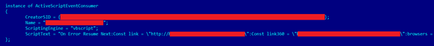 - Malicious script stored in Windows Management Instrumentation subscription (WMI)