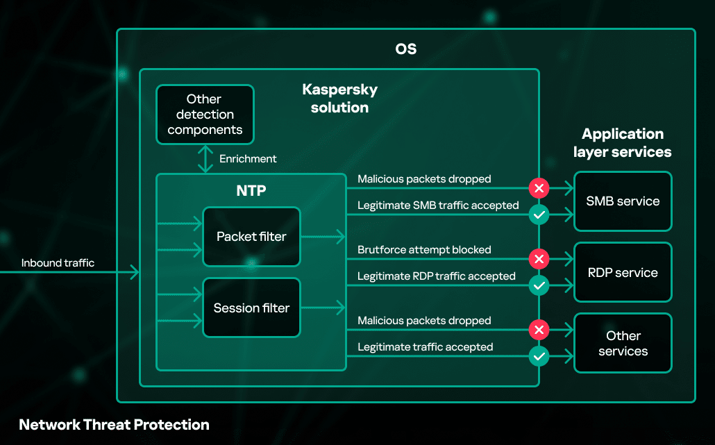 Network Threat Protection (NTP) is a component of Kaspersky products that detects and blocks network-based attacks. Such attacks include exploits against network vulnerabilities in software applications, system services and even operating systems, as well as port scanning, flood attacks and password brute-force attempts. Attackers can use a variety of techniques that can be detected on the network layer: