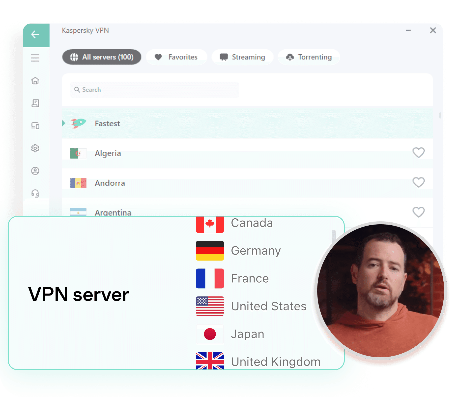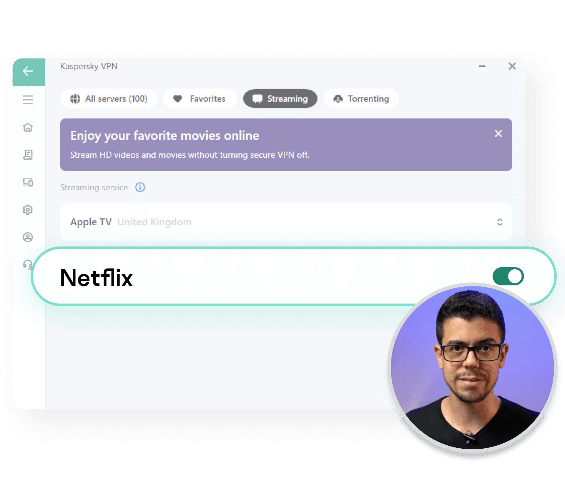 Kaspersky VPN delivers on privacy, speed, and more.Kaspersky VPN is proven to provide blazing-fast speeds for all your online needs – whether you're streaming, downloading, or browsing. Enjoy quick, secure access to popular sites like Netflix, Amazon Prime Video, Disney+, and more from any location thanks to our “solid speed ratings” and “strong transparency”, as noted by AV-TEST.