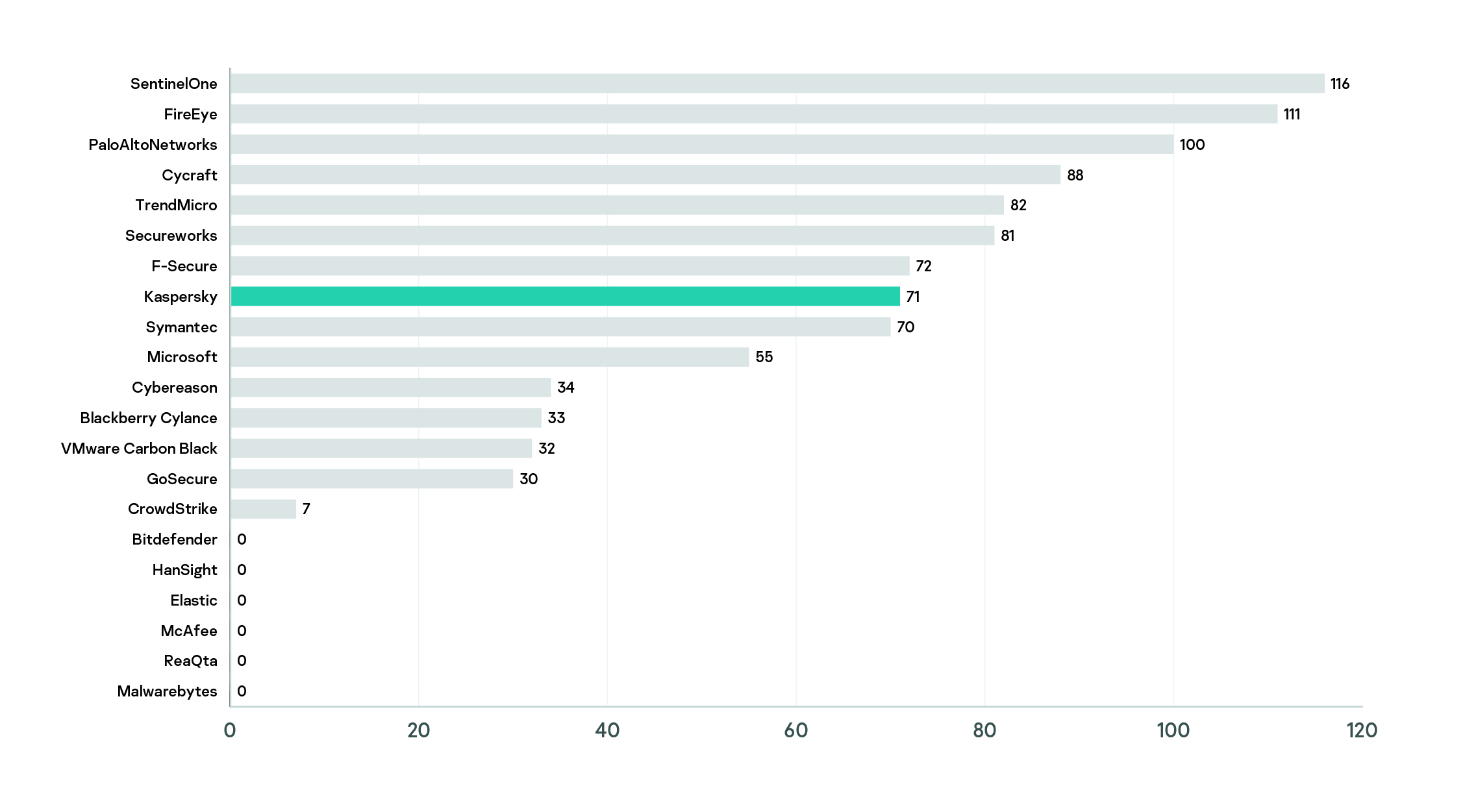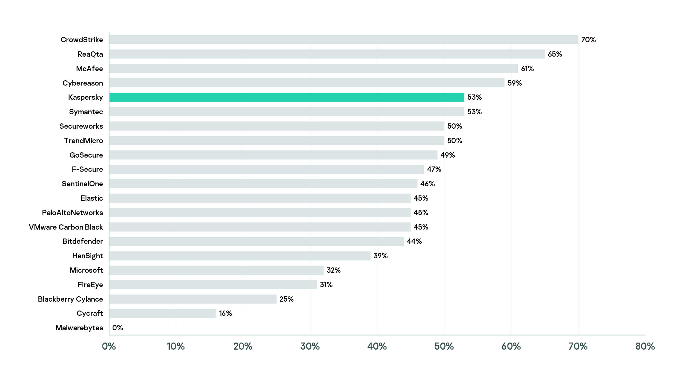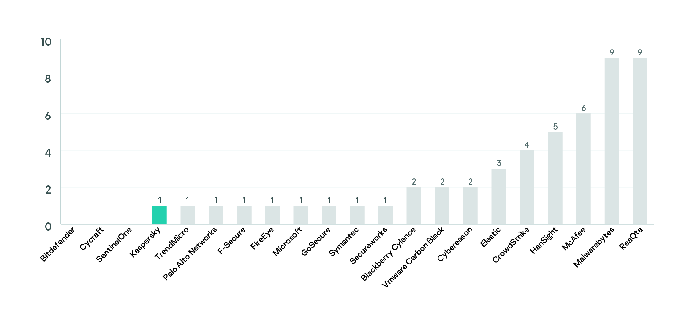 You can see that six of the vendors evaluated didn't support their EDR performance with any MSSP services at all. At Kaspersky, we believe that while many attack methods can be detected automatically, there are also those that require human expertise to uncover (in this test, for instance, no vendor was good enough with fully automatic detections on steps 4 and 11). That's why we feel that a comprehensive solution should combine a fully automated security product with a threat hunting service. During our Evaluation, the latter element was successfully handled by Kaspersky Managed Protection service which benefits from both automatic and manual detection.