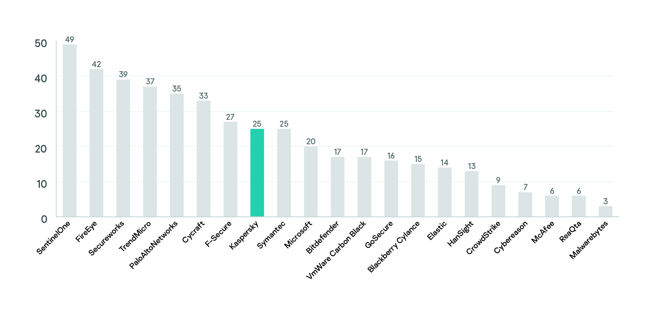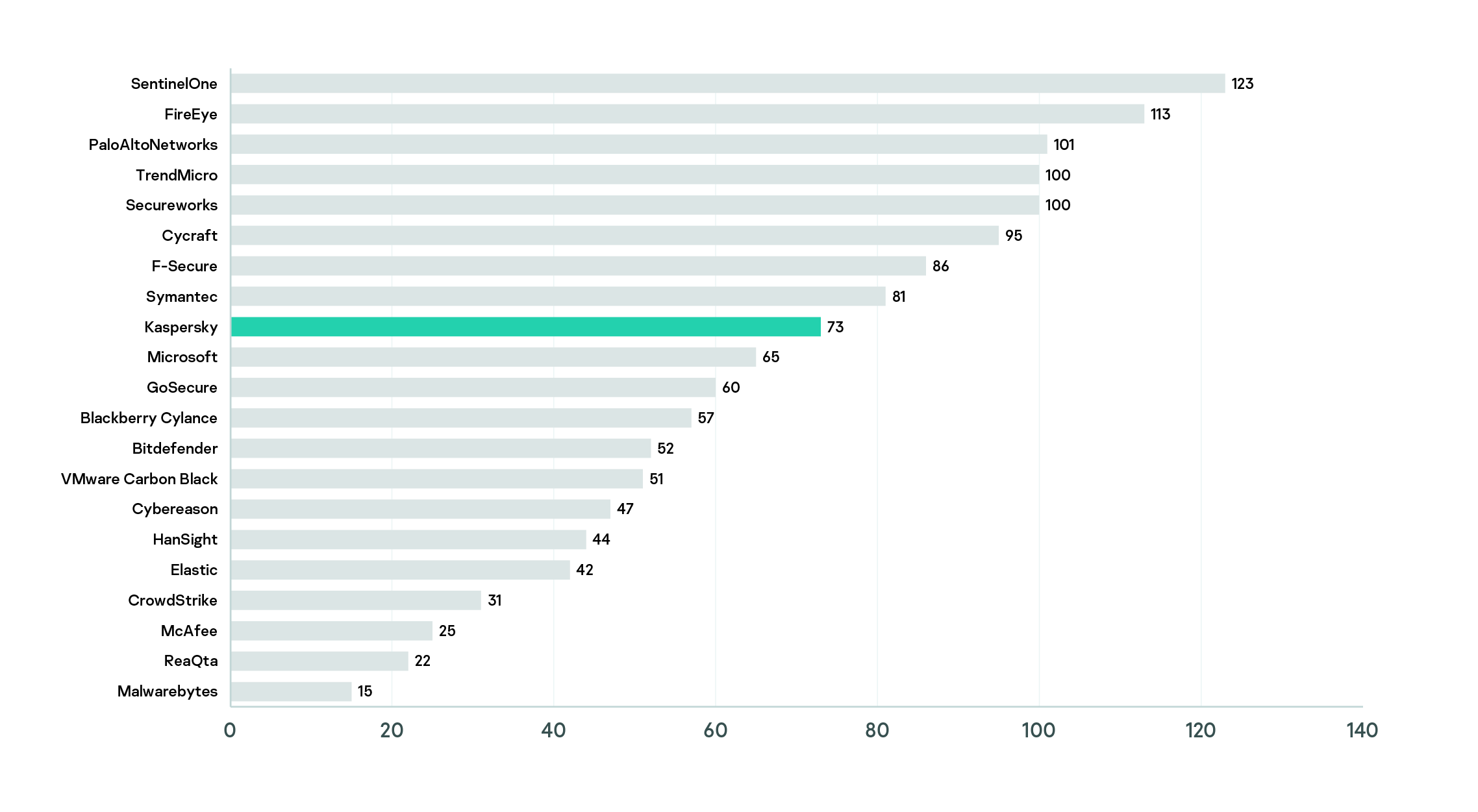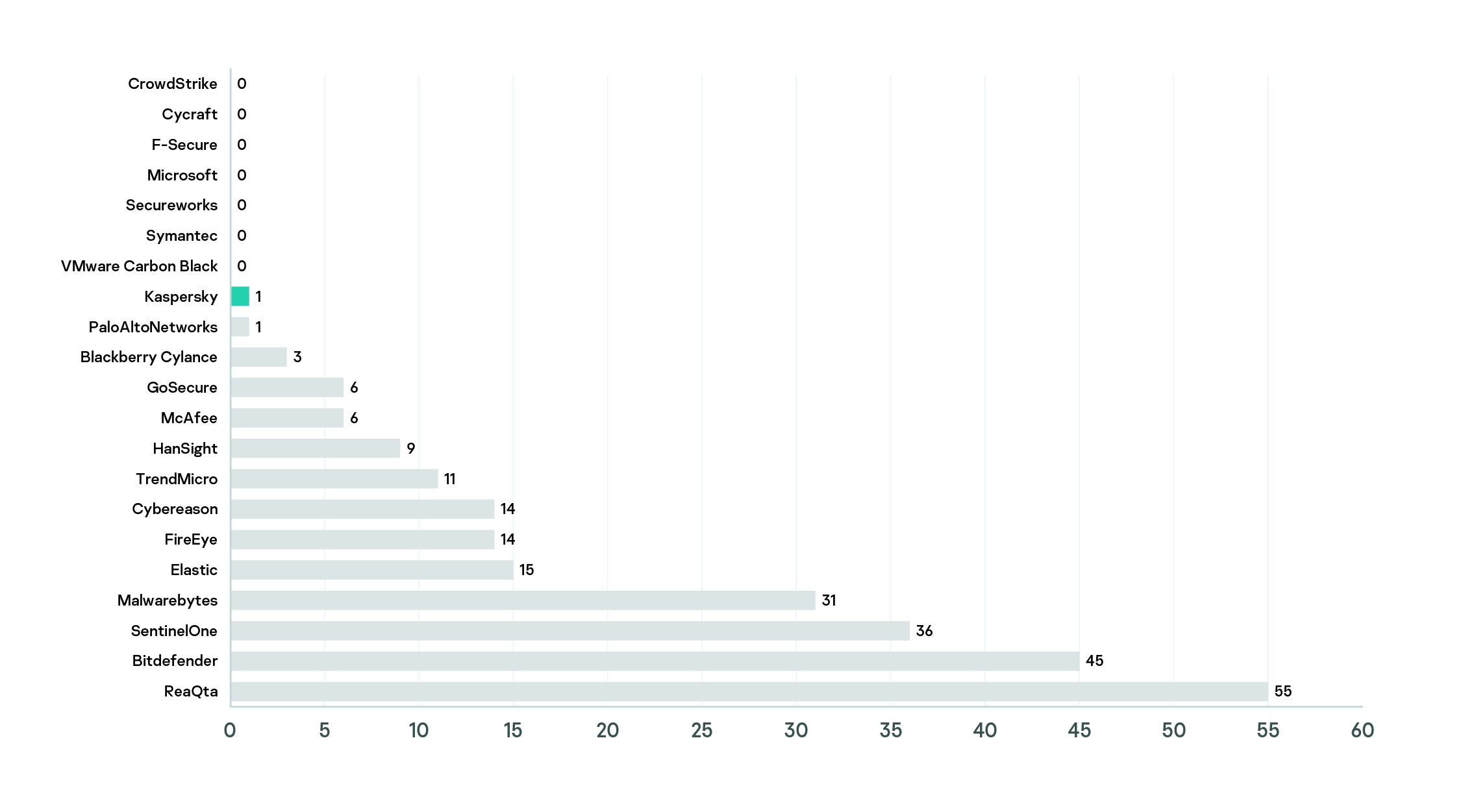 You can see that six of the vendors evaluated didn't support their EDR performance with any MSSP services at all. At Kaspersky, we believe that while many attack methods can be detected automatically, there are also those that require human expertise to uncover (in this test, for instance, no vendor was good enough with fully automatic detections on steps 4 and 11). That's why we feel that a comprehensive solution should combine a fully automated security product with a threat hunting service. During our Evaluation, the latter element was successfully handled by Kaspersky Managed Protection service which benefits from both automatic and manual detection.