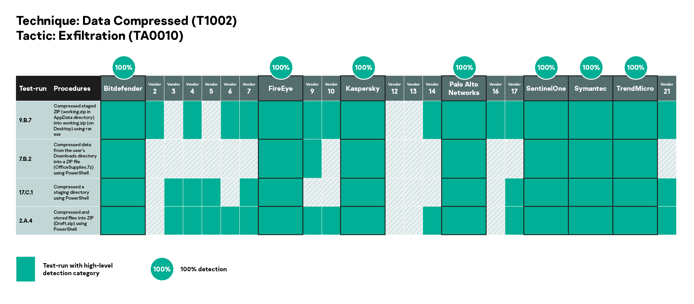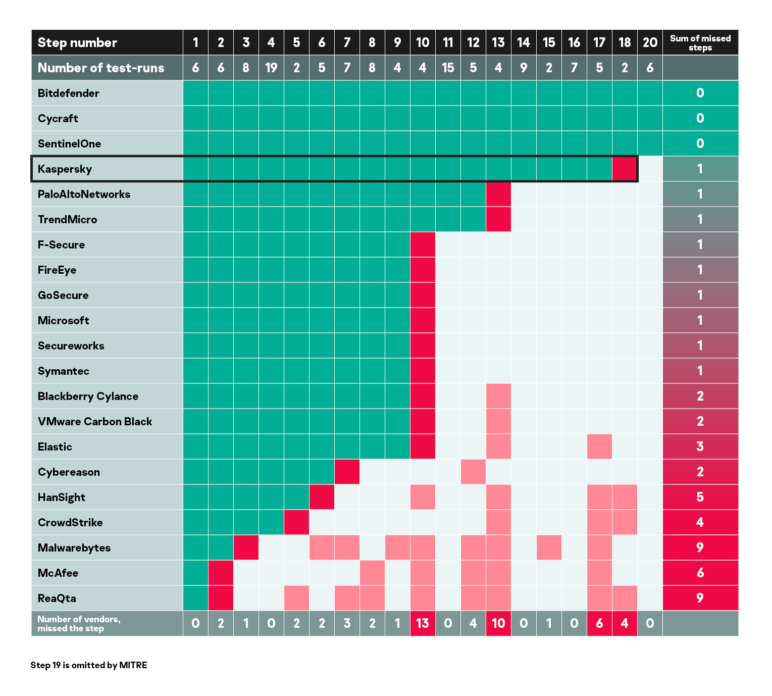 For Kaspersky, the only step without good detects was step 18 (Exfiltration), the last but one in the attack chain (see Figure 1). In a real-world situation, the security solution would have detected the attack long before this step was reached.