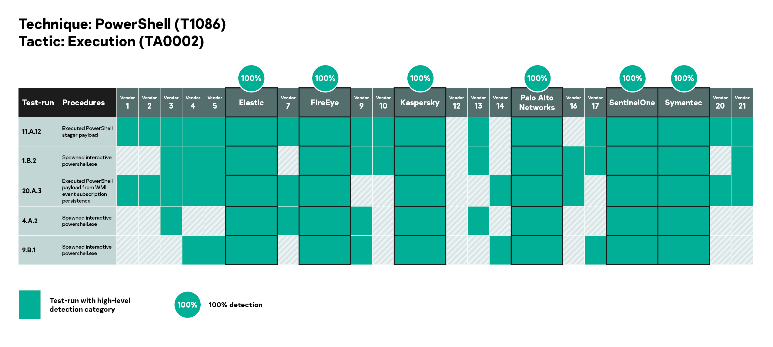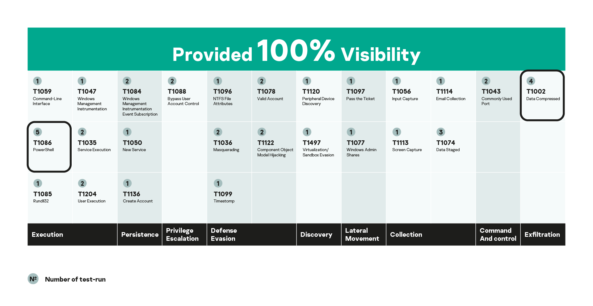 You can also use your own statistical instruments to further explore the Evaluation data most relevant to your organization’s particular needs and resources. For example, you could choose a particular technique from the Evaluation Round 2 scope - and see how it was covered by high-quality detections, such as 'Technique' or 'MSSP'. We've previously listed Round 2 techniques where Kaspersky's solution achieved 100% visibility - all the test runs for each of these techniques resulted in high-quality detections: