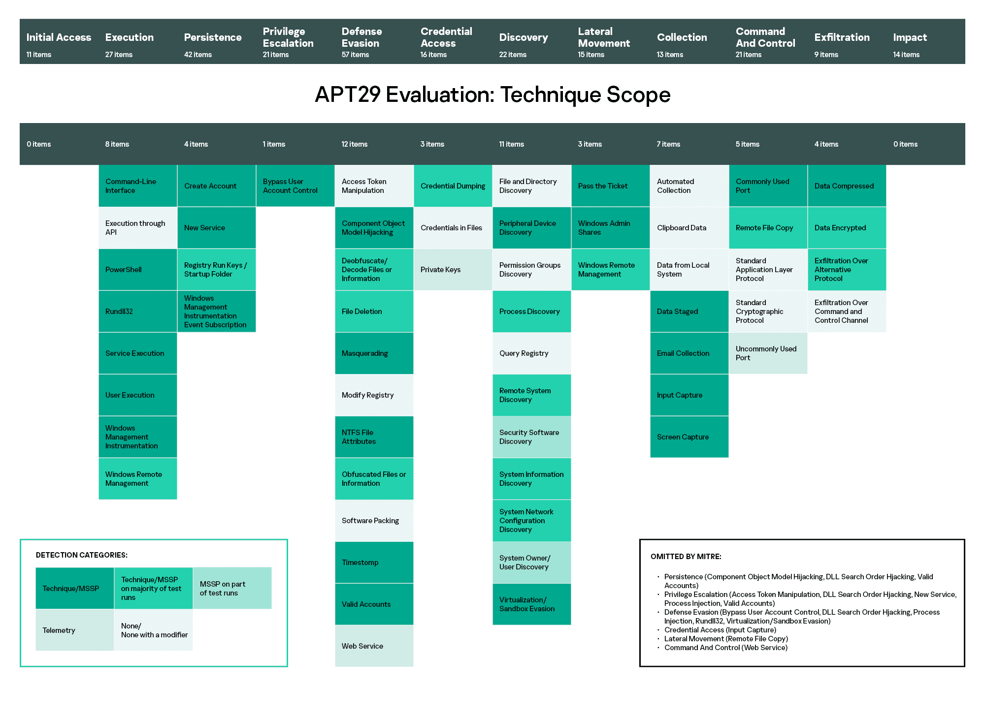 Adversary techniques in ATT&CK Evaluations are grouped by tactics, or stages of the attack. In general, our EDR product, together with our MDR service, showed good coverage of most of the techniques tested. The table below shows the ATT&CK tactics and techniques for APT29 detected by the Kaspersky solution: