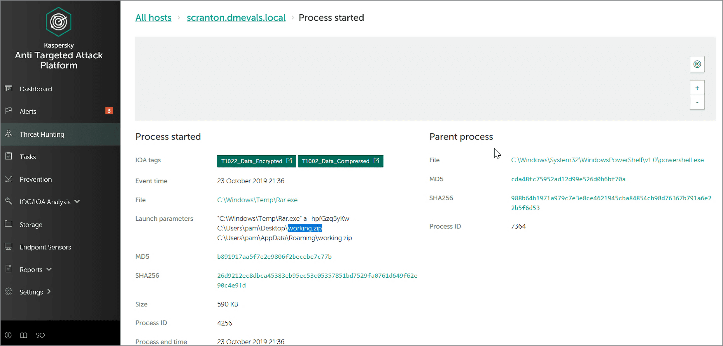 This method was used in the 9.B.7 step of the evaluation: adversaries applied additional compression to the collected archive and encrypted it with a password. Let's see how Kaspersky EDR detected this activity.