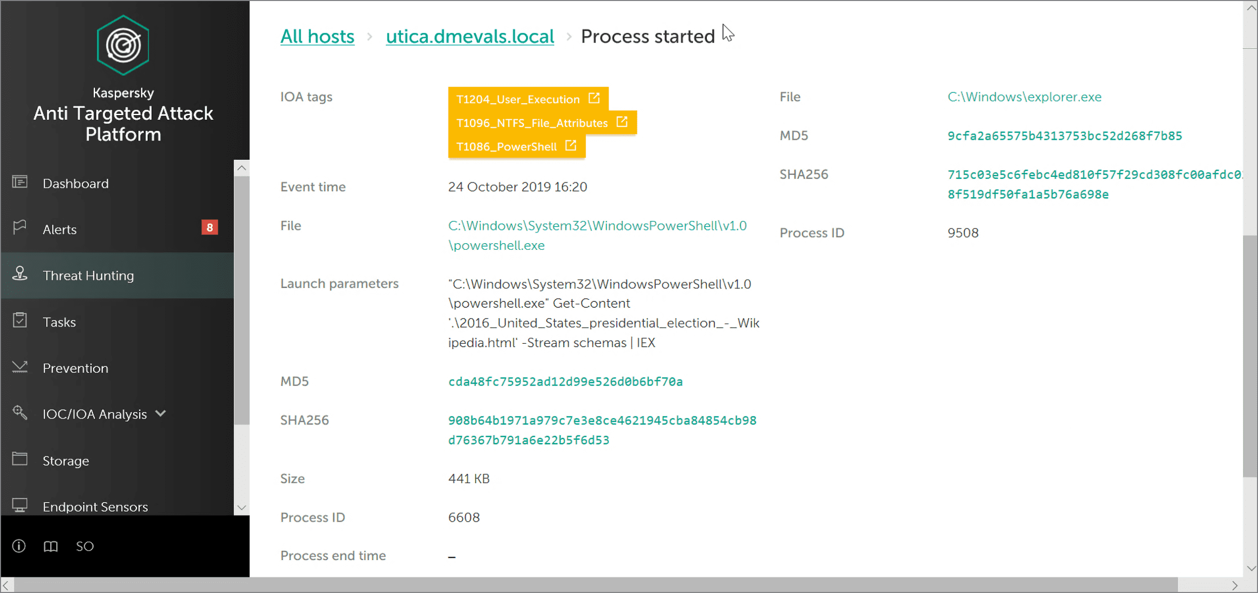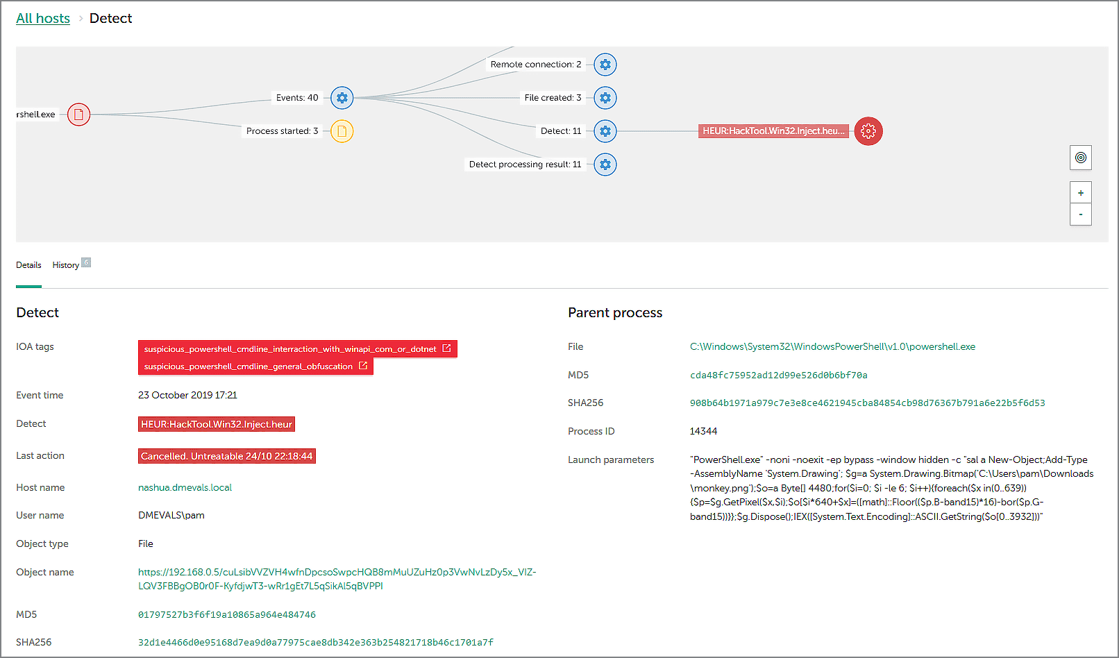 Our solution also indicates where this malicious file was uploaded from, and shows details of the Powershell commands used to restore the payload.