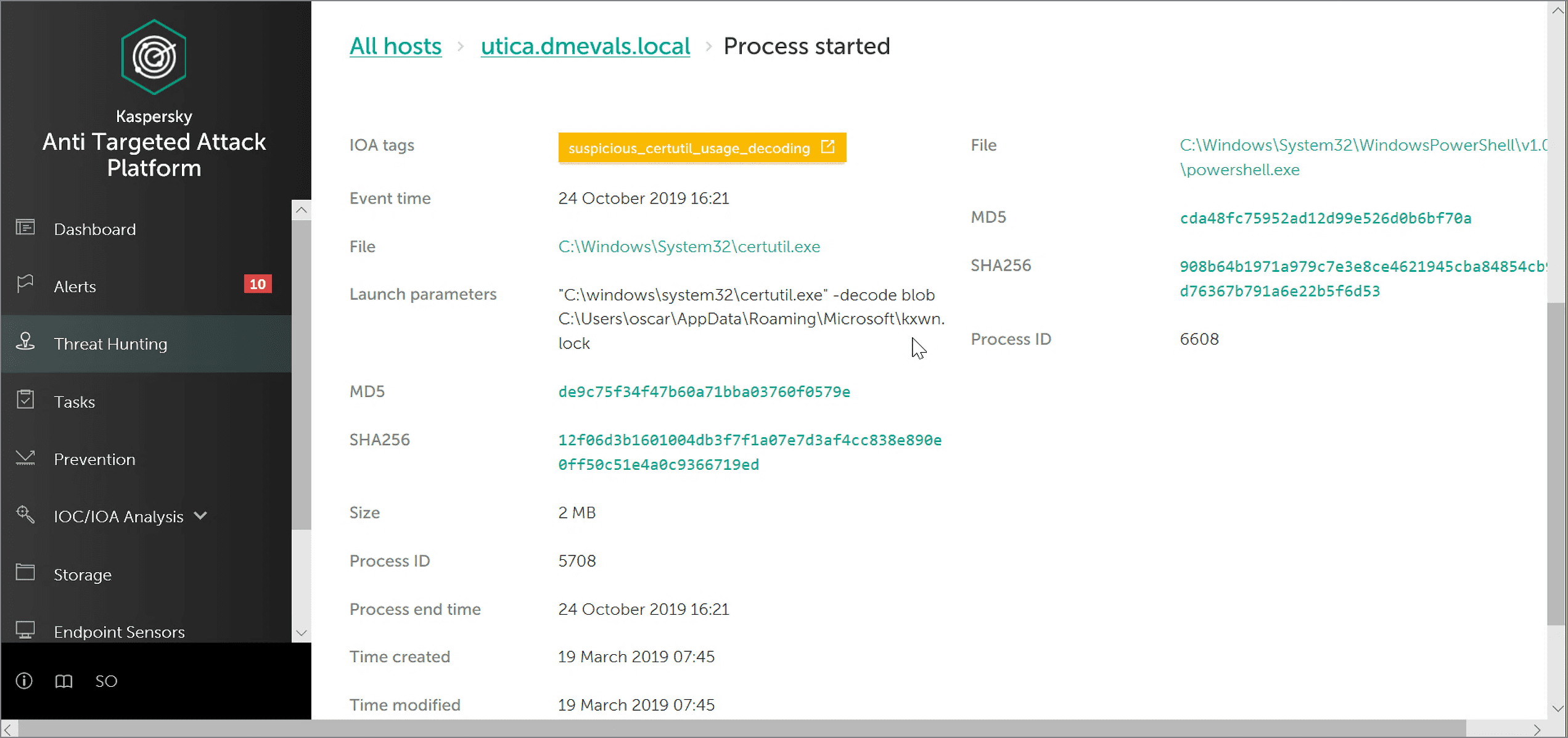 Kaspersky EDR has clearly warned the security officer about the suspicious usage of certutil.exe to decode the payload, and has also demonstrated the full command line used to run the decoding (see Launch Parameters section).