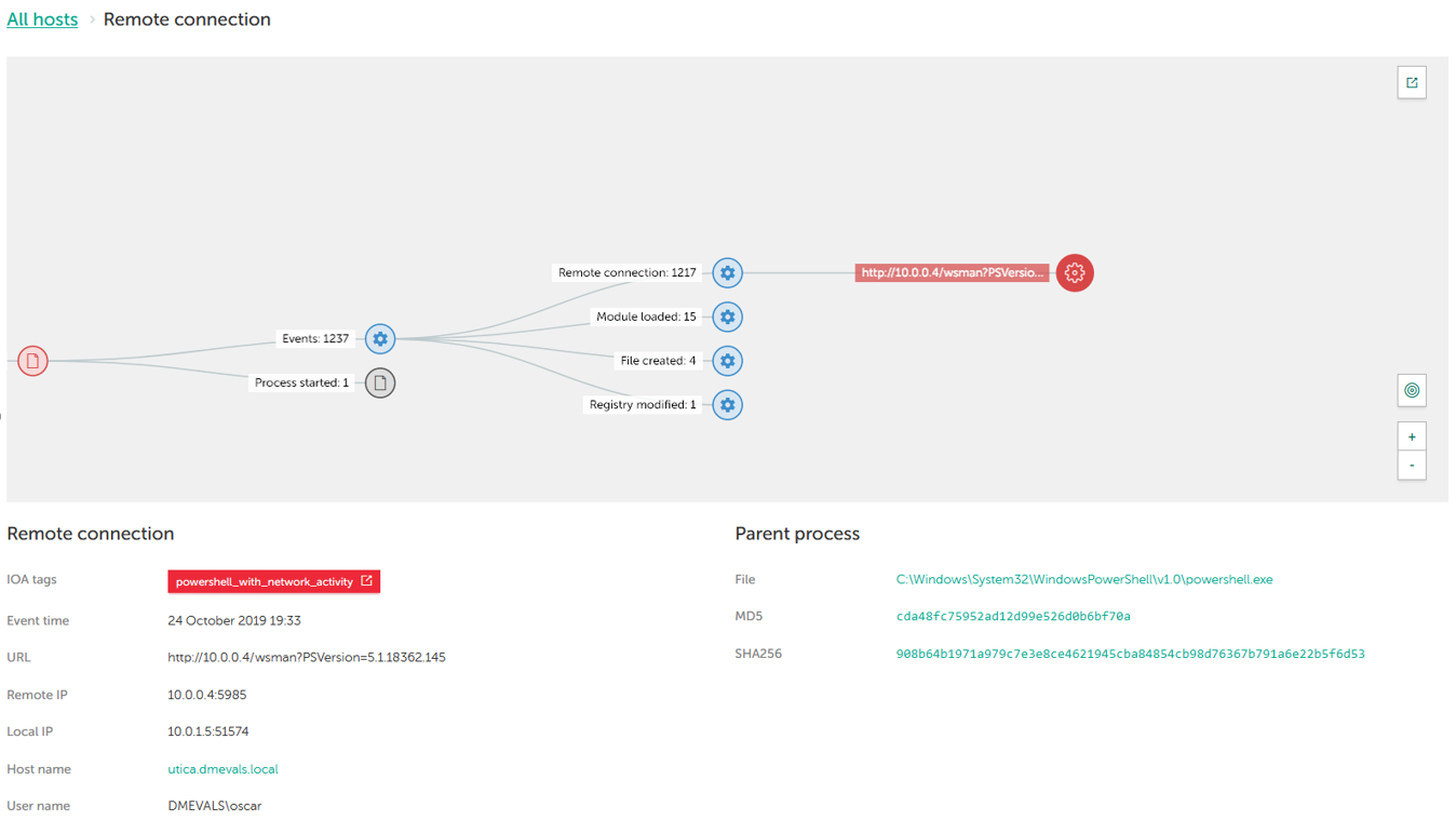 Our solution displayed the connection from Powershell to the 10.0.0.4 address, detected as powershell_with_network_activity - the red label means that an Alert was issued. WinRM use has been identified based on the “wsman” service name and the use of the 5985 port – we also showed this info in the test.