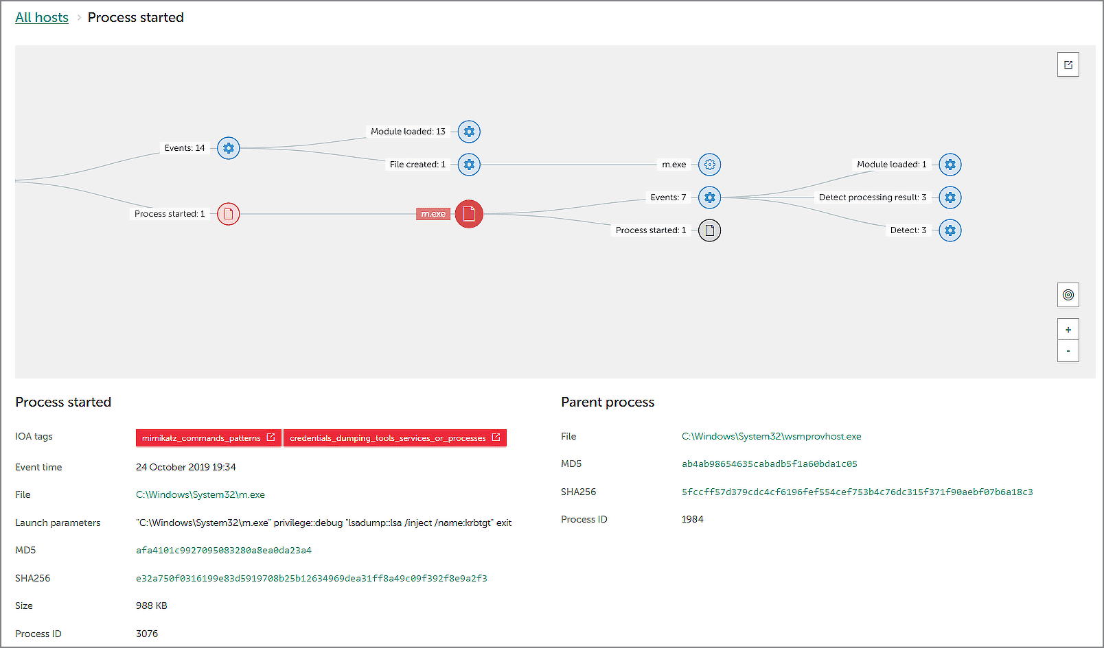Here you can see two red-label verdicts (mimikatz_commands_patterns и credentials_dumping_tools_services_or_processes) that correspond to the T1003 Credential Dumping technique. The security officer can also see the full command line used to run Mimikatz: the m.exe file is well-known to security experts.