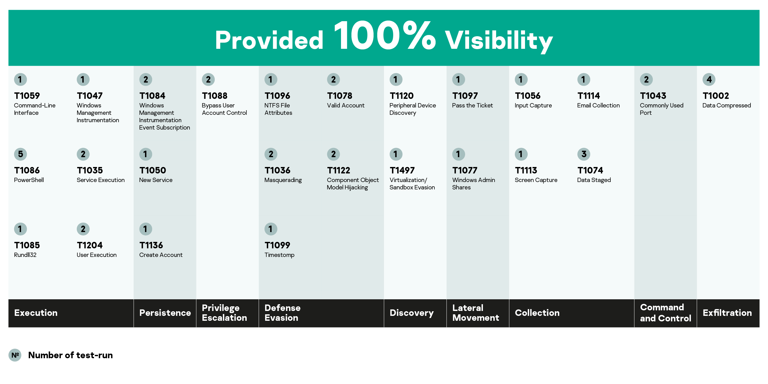 We can see that Kaspersky’s solution demonstrated its highest levels of visibility in the Execution, Persistence, Privilege Escalation, and Lateral Movement attack stages. Good visibility of these tactics, i.e. the ability of the security solution to display the events with sufficient completeness and detail, significantly increases the probability of successfully detecting an attack.