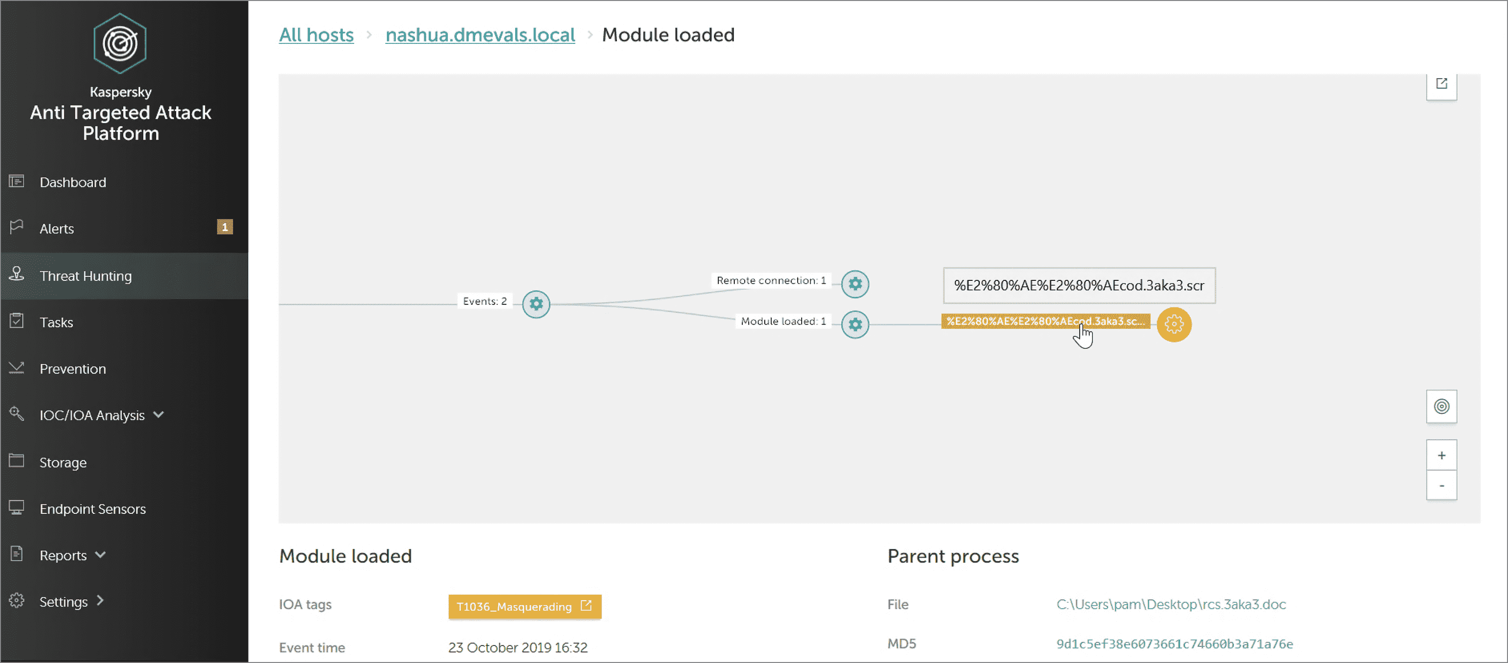 As you can see in the screenshot above, KEDR correctly labelled the technique in IoA Tags (yellow label) and revealed both names for the file: the name seen by the user (rcs.3aka3.doc) and the name with the real extension (.sсr). The security officer now has all the necessary data to recognize and understand this attempt to hide the real file extension.