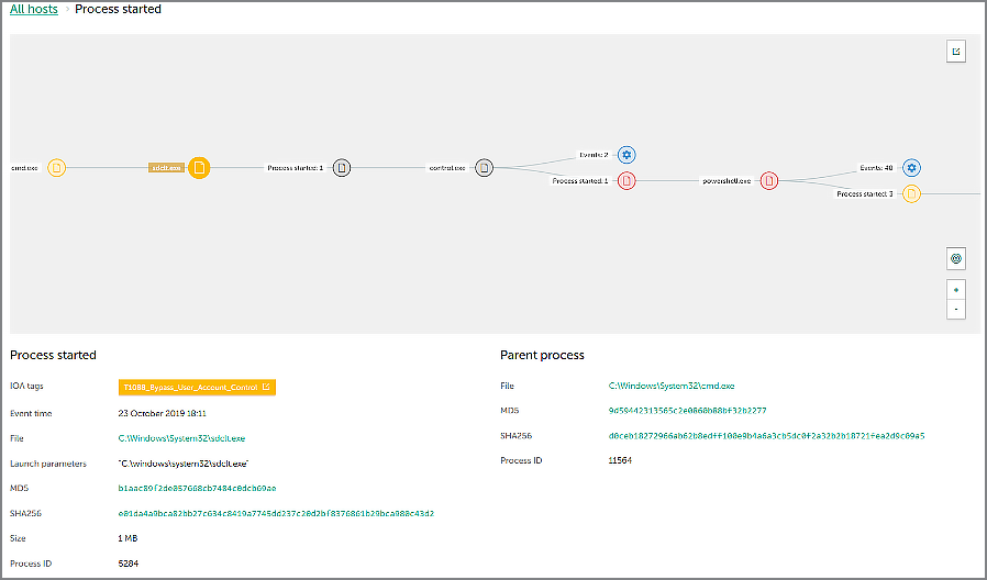 In this screenshot, we see the execution of sdctl.exe utility which is often used for BypassUAC techniques: this is due to the value of autoElevate (set to «true») in the manifest of this application. The yellow label shows the correct name of the detected attack technique.