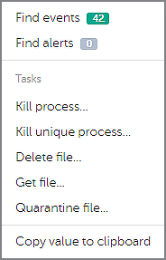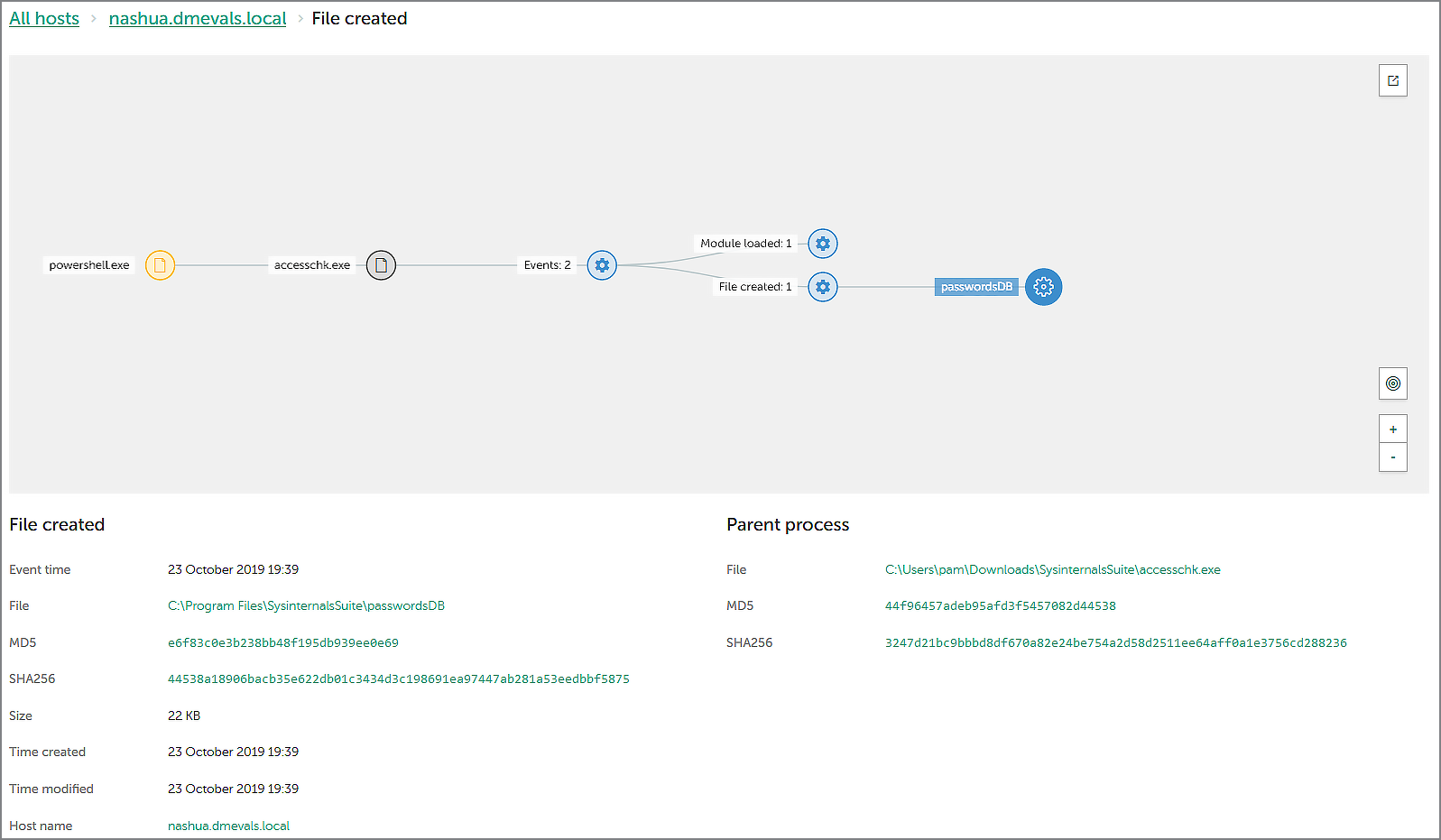According to the attack graph above, Powershell was used to run accesschk.exe, and this application, in turn, created a passwordDB file. Our EDR interface allows the retrieval of this file from the attacked endpoint by the security officer, just by clicking on the file name and selecting the «Get file» command: