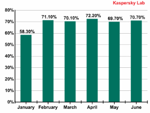 In Q2 the percentage of spam in total email traffic increased by 4.2% from the first quarter of 2013 and came to 70.7%. The percentage of phishing emails in global mail traffic fell by 0.0016% and came to 0.0024%. Malicious attachments were detected in 2.3% of all emails — that’s 1% less than in Q1 2013. These figures are among the results of Kaspersky Lab’s email traffic analysis for Q2 2013.